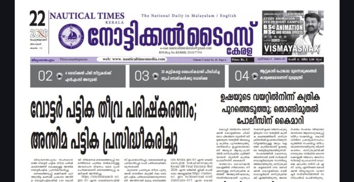 HomeE PAPERFeb 22 E PAPER Feb 22 By Yesudas Williams February 24, 2026 0 7 Share FacebookTwitterPinterestWhatsApp feb22-nau_260223_073813 TagsNautical Times Kerala Share FacebookTwitterPinterestWhatsApp Previous articleFeb 21Next articleFeb 23 Yesudas Williams RELATED ARTICLES E PAPER Feb 24 February 24, 2026 E PAPER Feb 23 February 24, 2026 E PAPER Feb 21 February 21, 2026 LEAVE A REPLY Cancel reply Comment: Please enter your comment! Name:* Please enter your name here Email:* You have entered an incorrect email address! Please enter your email address here Website: Save my name, email, and website in this browser for the next time I comment. - Advertisment - Most Popular Feb 24 February 24, 2026 Feb 23 February 24, 2026 Feb 21 February 21, 2026 Feb 20 February 20, 2026 Load more Recent Comments
