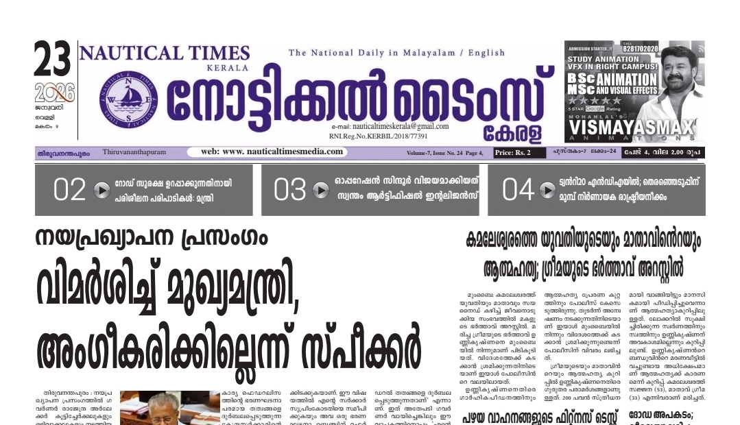 HomeE PAPERJan 23 E PAPER Jan 23 By Yesudas Williams January 24, 2026 0 30 Share FacebookTwitterPinterestWhatsApp jan-23-nauti_260123_000240 TagsNautical Times Kerala Share FacebookTwitterPinterestWhatsApp Previous articleJan 24Next articleJan 28 Yesudas Williams RELATED ARTICLES E PAPER Feb 02 February 3, 2026 E PAPER Feb 01 February 1, 2026 E PAPER Jan 31 January 31, 2026 LEAVE A REPLY Cancel reply Comment: Please enter your comment! Name:* Please enter your name here Email:* You have entered an incorrect email address! Please enter your email address here Website: Save my name, email, and website in this browser for the next time I comment. - Advertisment - Most Popular Feb 02 February 3, 2026 Feb 01 February 1, 2026 Jan 31 January 31, 2026 Jan 29 January 29, 2026 Load more Recent Comments